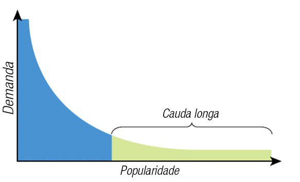 A teoria de Chris Anderson fala dos produtos menos populares, dos gostos das minorias, dos produtos e serviços que não chegam ao público através da distribuição tradicional, aqueles que não se veem nas lojas nem na televisão, mas que agora estão nos mercados mais exigentes e na INTERNET, onde os consumidores têm gostos mais afluentes e diversificados. Ela mostra que a grande rede deu origem a um mercado onde a receita total de muitos de produtos de nicho de baixo volume de vendas equivale à receita total de poucos produtos de grande sucesso.